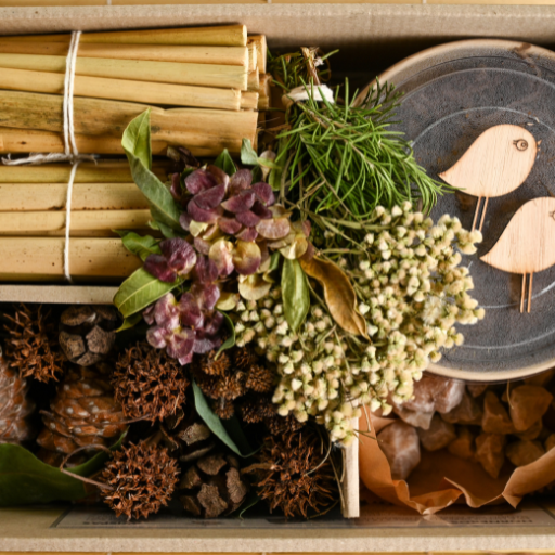 Este kit contiene todos los elementos necesarios para crear y ambientar una escena decorativa centrada en un nido de pájaros.