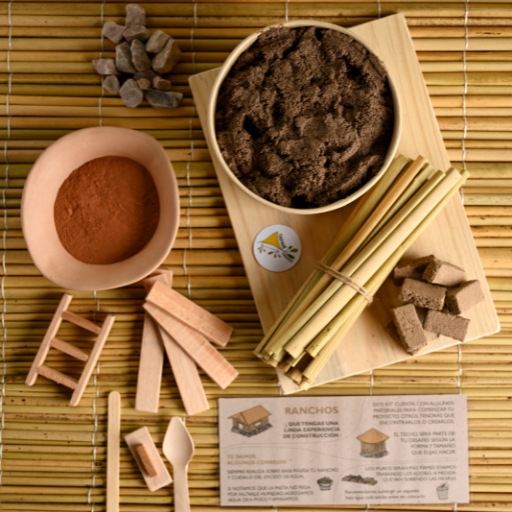 Este kit contiene todos los materiales esenciales para la construcción y decoración manual de una escena de rancho o casa tradicional de campo, utilizando la técnica de adobes.